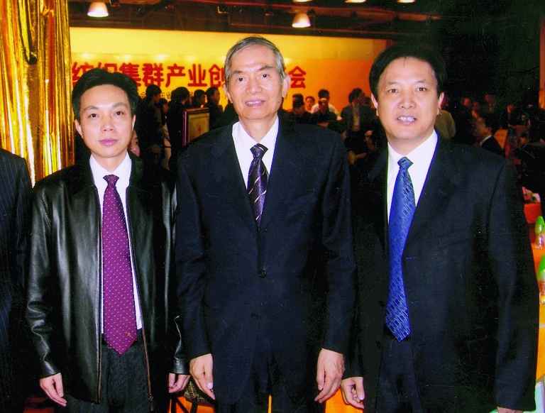 時(shí)任中國(guó)紡織工業(yè)協(xié)會(huì)副會(huì)長(zhǎng)許坤元與時(shí)任中共海寧市委書記馮水華、董事長(zhǎng)沈國(guó)甫在海寧