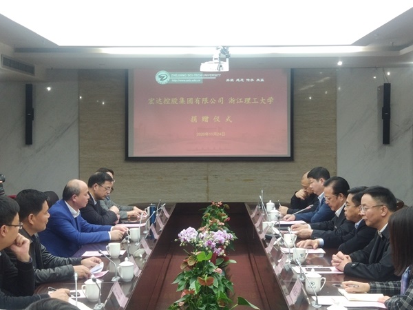 11月24日下午4點,捐贈儀式在浙江理工大學(xué)行政樓308會議室舉行。浙江省教育廳黨委副書記干武東、海寧市人民政府副市長楊文華、海寧市許村鎮(zhèn)人民政府黨委書記杜瑩池、宏達控股集團、宏達高科董事長沈國甫、宏達控股集團總經(jīng)理、高科副董事長沈珺等嘉賓,浙江理工大學(xué)校長陳文興、教育發(fā)展基金會理事長陳建勇以及相關(guān)職能部門負責(zé)人出席捐贈儀式。浙江理工大學(xué)校黨委副書記周文龍主持儀式。