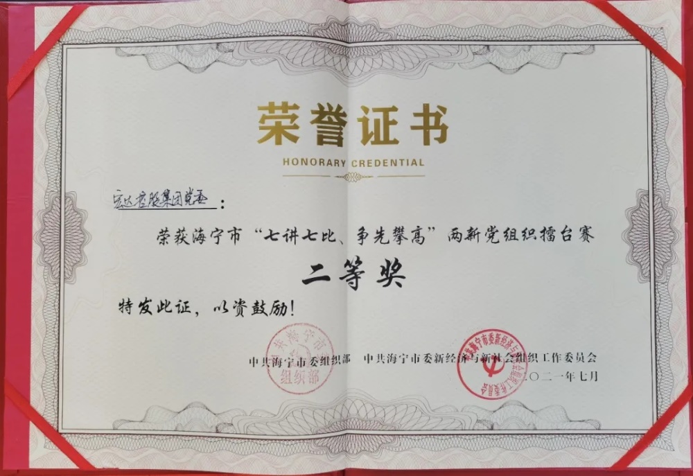 為深入學(xué)習(xí)貫徹習(xí)近平新時(shí)代中國(guó)特色社會(huì)主義思想,大力弘揚(yáng)“紅船精神”,進(jìn)一步深化黨建高地創(chuàng)建,2021年7月29日下午,在有近300人參加的兩新組織書(shū)記(黨務(wù)工作者)培訓(xùn)班上,海寧市委組織部舉辦了“七講七比、爭(zhēng)先攀高”兩新黨組織擂臺(tái)賽。行政支部許銓代表宏達(dá)集團(tuán)黨委參賽,榮獲二等獎(jiǎng)。