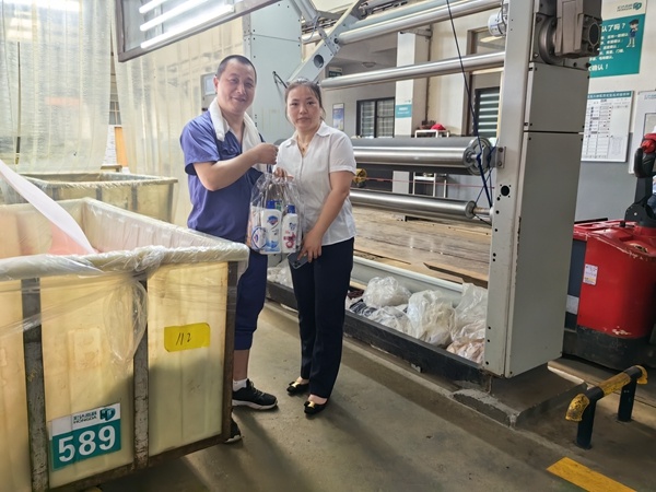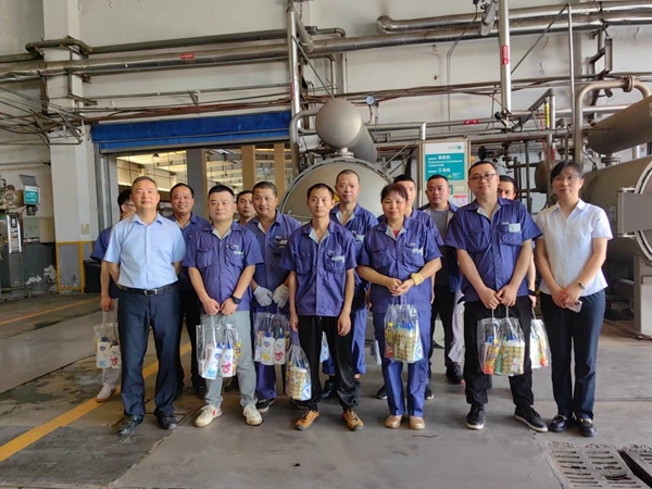 在“宏達(dá)高科”溫度最高的染整定型、染整染色車間,公司管理人員向堅(jiān)守崗位的一線員工表示親切的慰問和感謝,為他們送上毛巾、沐浴露等清涼用品,囑咐大家高溫生產(chǎn)不忘安全,做到勞逸結(jié)合,并要求各部門切實(shí)做好防暑降溫工作,保障員工健康安全。