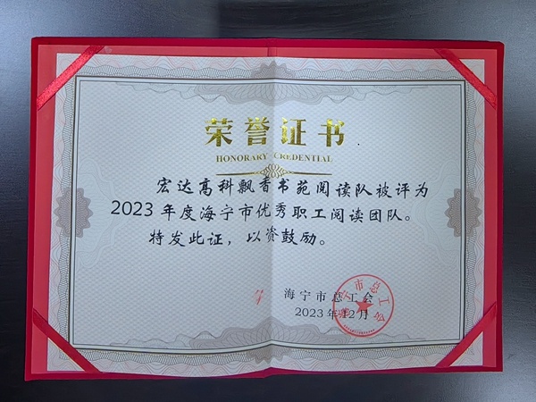4月8日,“工會向潮?悅讀相伴”海寧市職工有聲書屋建設(shè)現(xiàn)場會暨海寧市第七屆職工文化藝術(shù)節(jié)開幕式在鹽官鎮(zhèn)舉行,宏達(dá)高科控股股份有限公司在會上被評為海寧市“書香企業(yè)”,“宏達(dá)高科”飄香書苑職工閱讀團(tuán)隊被評為2023年度海寧市優(yōu)秀職工閱讀團(tuán)隊。