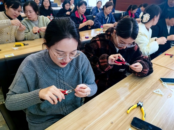 課堂上,海宮的專(zhuān)業(yè)老師拿起制作材料,向女職工們演示手串制作。現(xiàn)場(chǎng)女職工們面前擺放著手串的制作材料,以及珠寶鉗等制作工具。在老師的耐心指導(dǎo)下,大家紛紛制作起了手串,感受手工帶來(lái)的魅力。