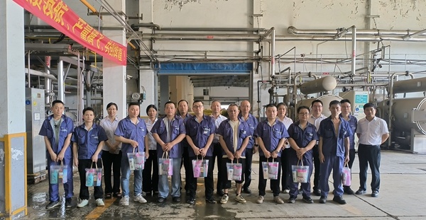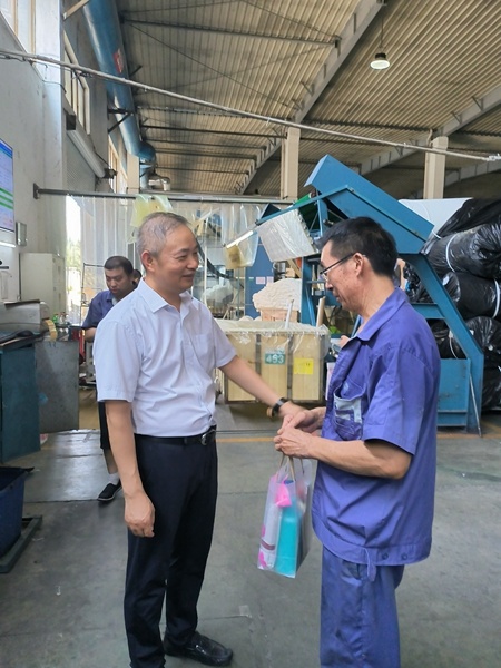 在“宏達(dá)高科”生產(chǎn)車間,工人們正揮汗如雨,緊張有序地進(jìn)行著定型、染色等工序。許建舟總經(jīng)理一行帶著防暑降溫物資,親手將裝著沐浴露、冰紅茶、毛巾等物品的“防暑降溫大禮包”遞到員工手中,并向他們送上了誠摯問候與深切敬意。