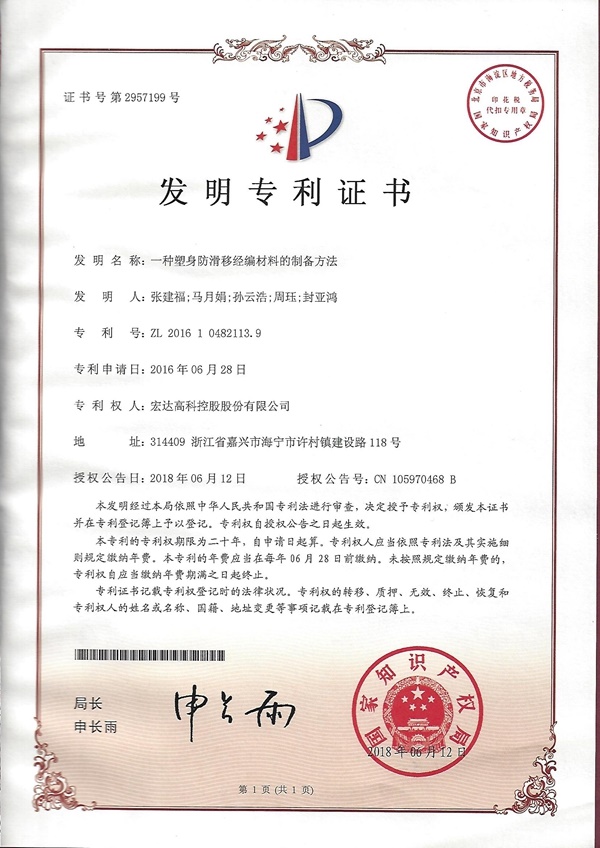 據(jù)了解,本次“宏達(dá)高科”獲得專(zhuān)利的發(fā)明內(nèi)容是:一種塑身防滑移經(jīng)編材料的制備方法;運(yùn)用本專(zhuān)利所制備的運(yùn)動(dòng)服飾面料,其氨綸彈性纖維面與人體接觸時(shí)對(duì)皮膚具有一定的黏附性,能減小運(yùn)動(dòng)時(shí)服飾面料的滑移,從而減小摩擦;又因該面料拉伸彈性大,能對(duì)人體肌肉有一定的壓力、起固定作用,因此還能有效防止運(yùn)動(dòng)時(shí)造成的肌肉、關(guān)節(jié)受傷,減輕運(yùn)動(dòng)人員的肌肉疲勞度,提高運(yùn)動(dòng)塑身的效率和效果。另外2項(xiàng)獲得的外觀設(shè)計(jì)專(zhuān)利,是對(duì)公司自主開(kāi)發(fā)的兩種汽車(chē)內(nèi)飾面料進(jìn)行的外觀設(shè)計(jì)專(zhuān)利保護(hù)。
