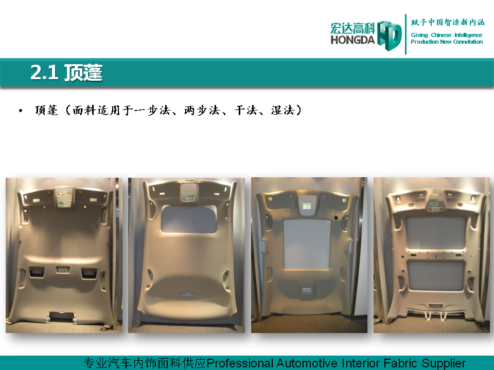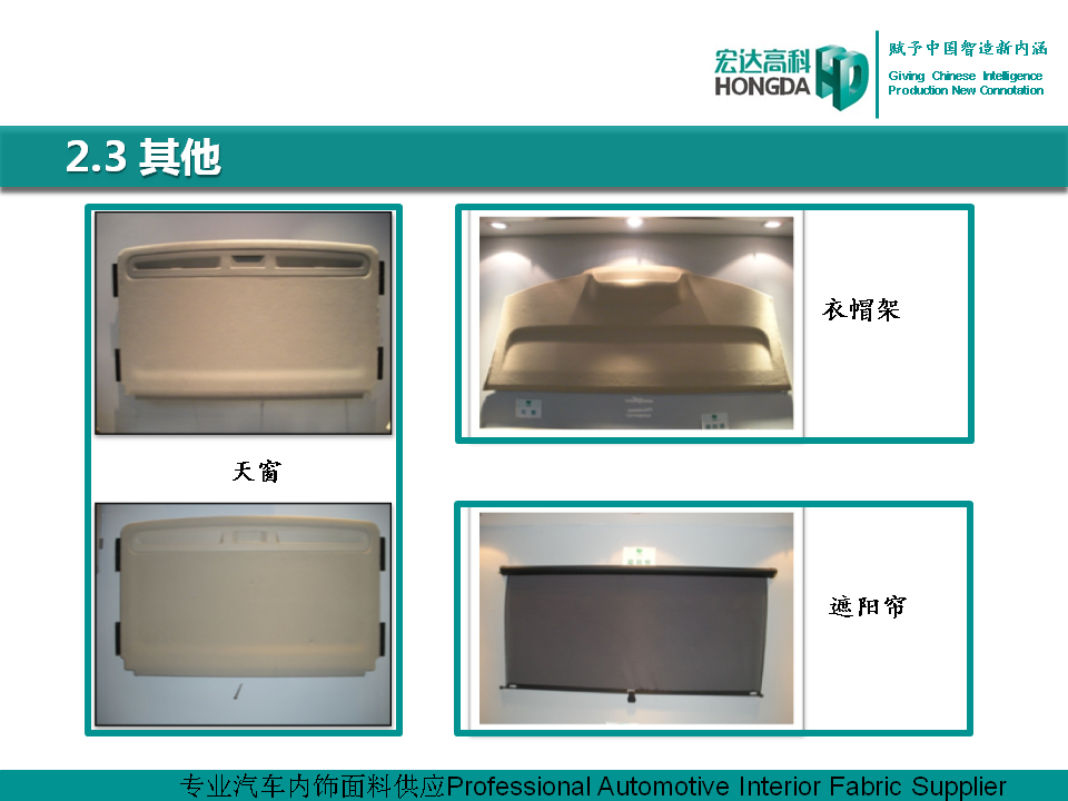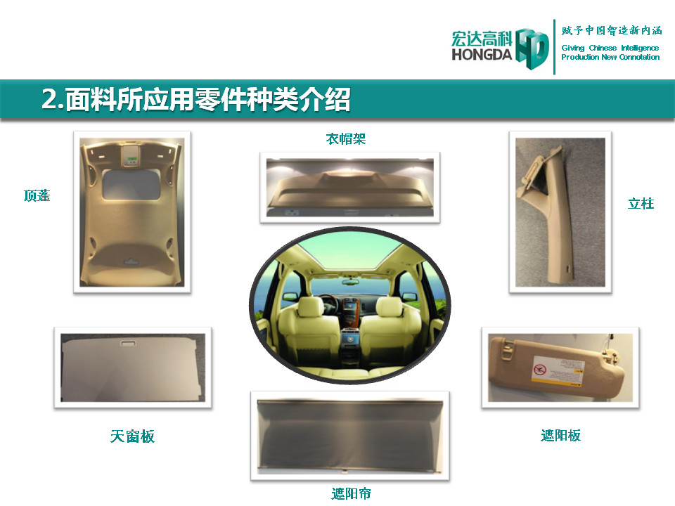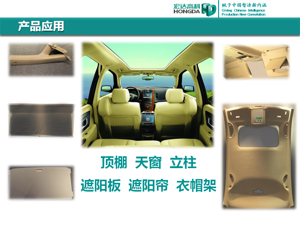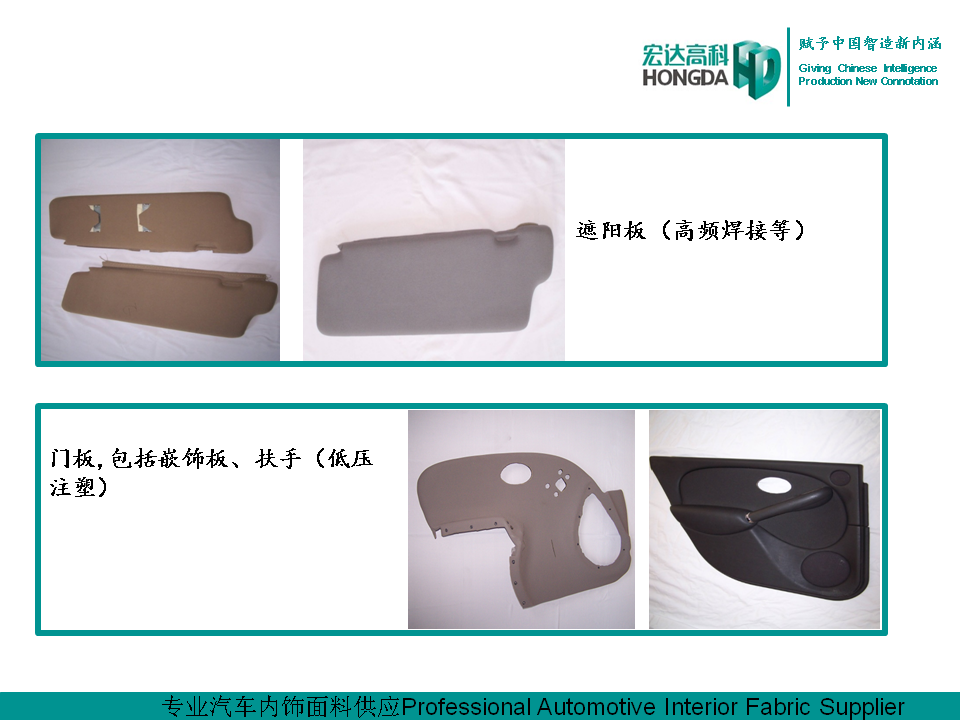 汽車內(nèi)飾面料是宏達(dá)高科的主導(dǎo)產(chǎn)品,通過國家火炬計(jì)劃項(xiàng)目驗(yàn)收,列入國家重點(diǎn)新產(chǎn)品。產(chǎn)品采用進(jìn)口原料和先進(jìn)的生產(chǎn)工藝,具有防油、防水、防污、吸音、阻燃、耐光照等特性,各項(xiàng)技 術(shù)指標(biāo)性能達(dá)到國際先進(jìn)水平,現(xiàn)已成為國內(nèi)十多家大型汽車制造企業(yè)主要的內(nèi)飾面料供應(yīng)商,并出口美國、德國等